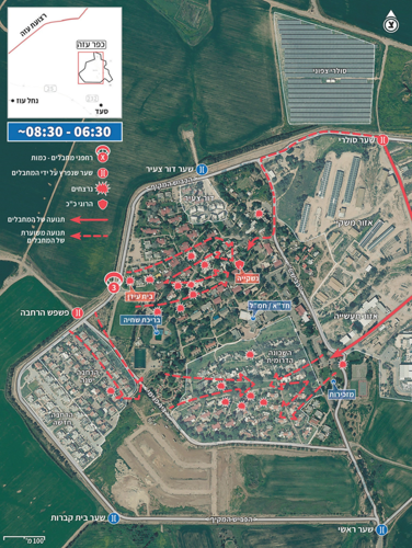 26 בשטח היישוב נמנו ארבע נפילות של רקטות. התחקיר המבצעי מלחמת חרבות ברזל, אוגדה ,143 תחקיר הקרב על כפר עזה ,7.10.2023-10.10.2023 אוגוסט 2024 (להלן: התחקיר המבצעי).