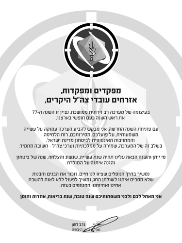 עם פתיחת השנה החדשה, אני מבקש להביע הערכה עמוקה על עשייה משמעותית, על פועלכם, מסירותכם, רוח הלחימה והמחויבות האינסופית לביטחון מדינת ישראל.