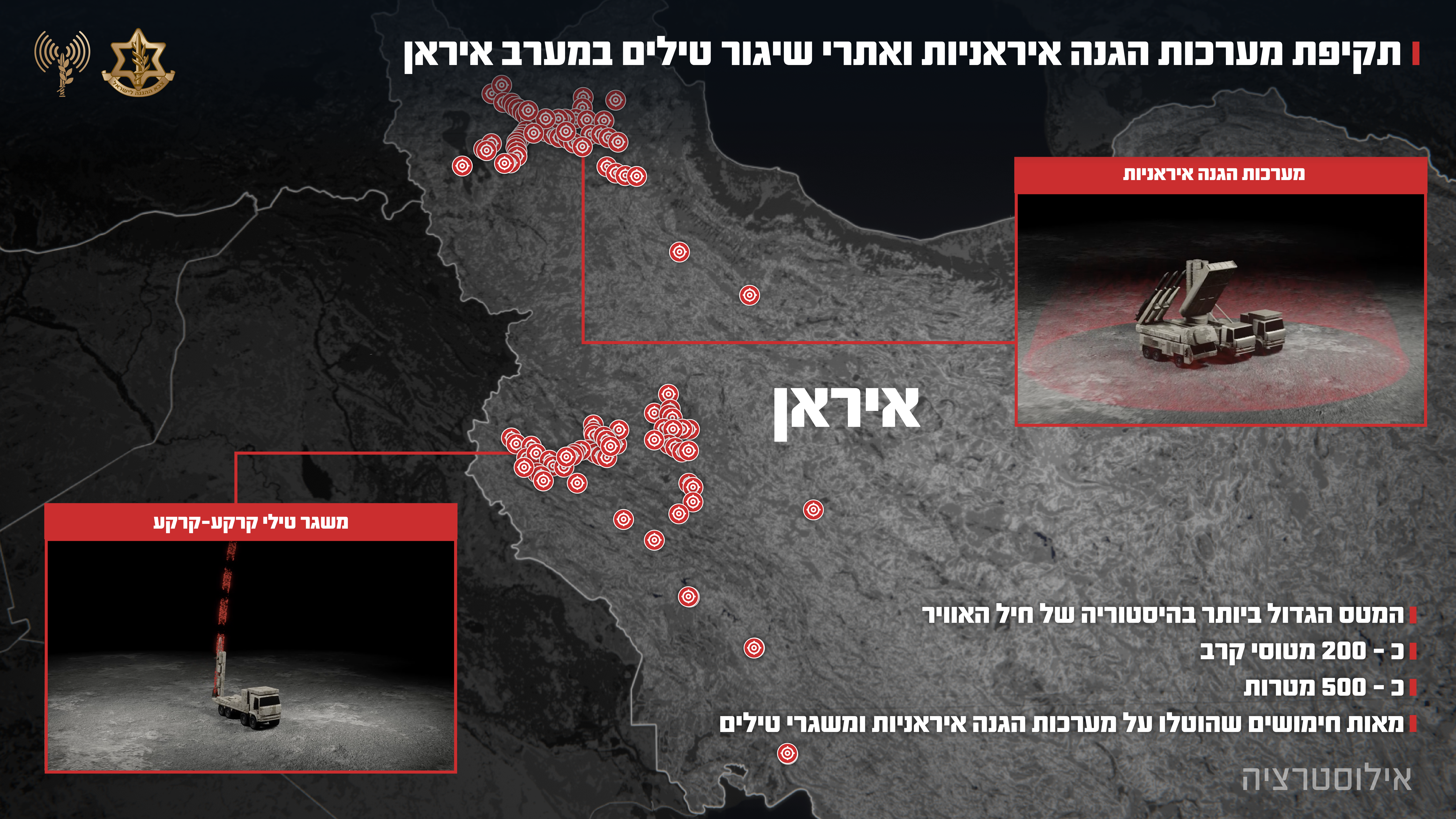 מאז שעות הבוקר, כ-200 מטוסי קרב בהכוונת אמ"ן וחיל האוויר, השלימו מהלומה נרחבת נגד מערך הטילים ומערכות ההגנה של משטר הטרור האיראני במערב ומרכז איראן.