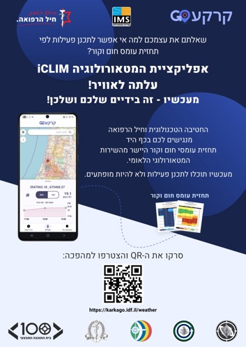 בימים אלה ממש, משיקים חיל הרפואה והחטיבה הטכנולוגית ליבשה את iClim, יישומון ייעודי לתכנון מטאורולוגי, שמביא לראשונה למפקדים ולמפקדות תחזית עומסי חום וקור - היישר לכף ידם. הכלי החדש, מאפשר לקבל החלטות על בסיס ההנחיות הצבאיות, עוד לפני שהכוח יוצא לשטח.