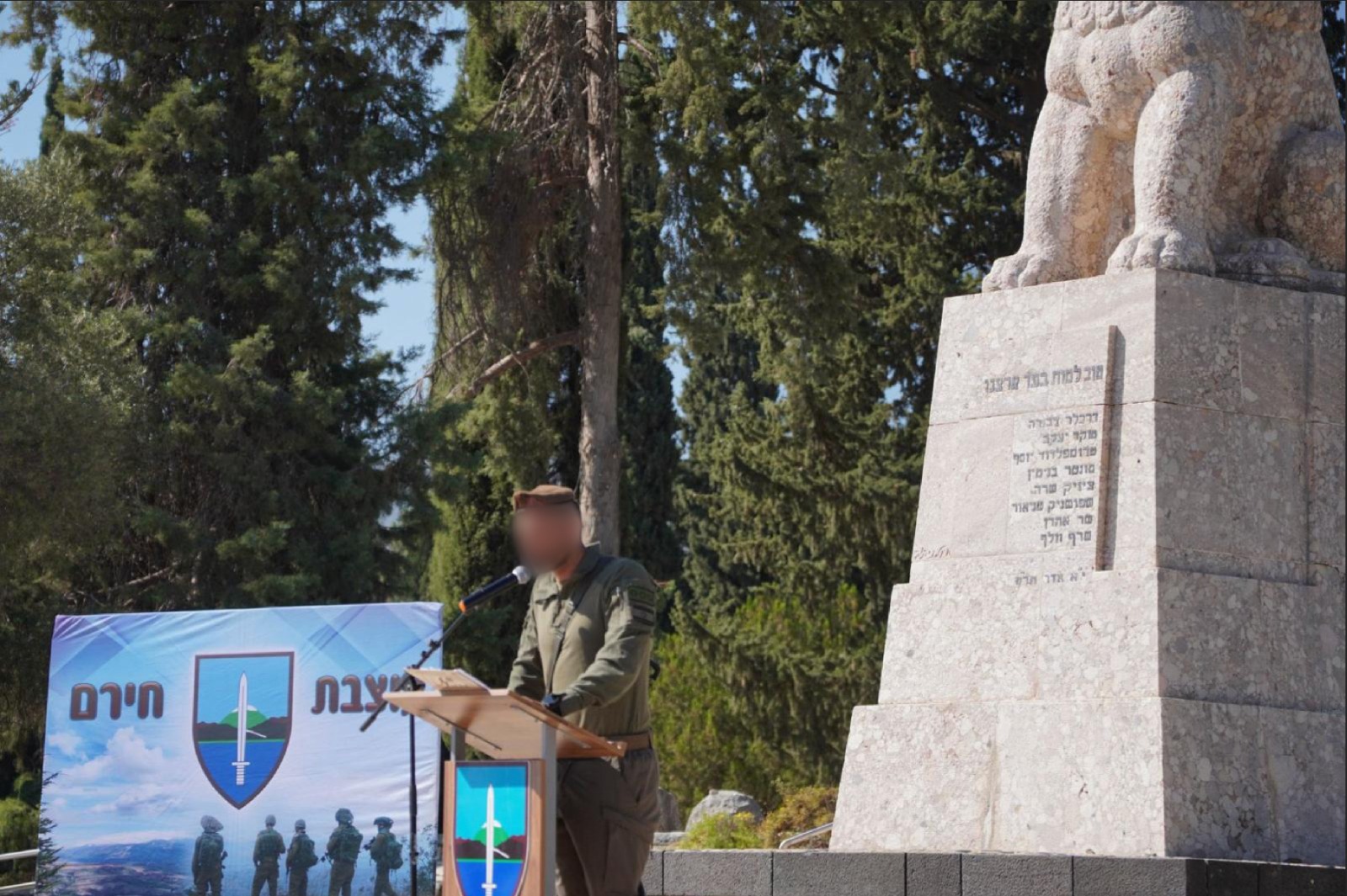 מעמד עוצבת 'חירם' (769) באנדרטת 'האריה השואג', תל חי, בראשות מפקד עוצבת 'חירם' (769), אל"ם י'