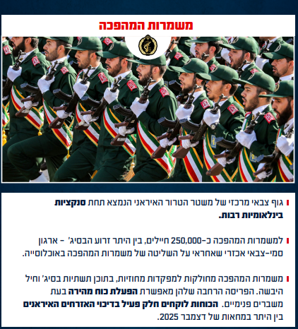 גוף סמי-צבאי זה, הנמצא תחת סנקציות בינלאומיות רבות, מונה כ-250,000 חיילים הפזורים במפקדות מחוזיות, בתוכן גם הבסיג' וחיל היבשה. פריסתם הרחבה מאפשרת הפעלת כוח מהירה ואכזרית, בין היתר במחאות דצמבר 2025.