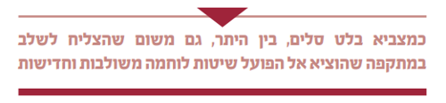 בבואו לקרוא את ספרו של סלים הקורא הישראלי צריך לזכור שגם צה"ל מצא עצמו במצב דומה, שבו הופתע ונקלע לעמדת נחיתות קשה, ומצביאיו, הרמטכ"ל בראשם, נדרשו לגבש מענה רלוונטי ולהפעיל את הכוחות בצורה המקצועית והנכונה לאור המצפן האסטרטגי.