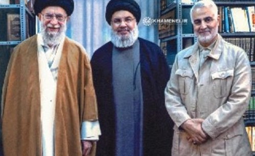מזכ"ל חזבאללה, השייח' נצראללה לצידם של מנהיגה העליון של איראן, האייתוללה ח'אמנאי (שמאל), ומפקד כוח קודס, סולימאני (ימין), בשנת 2019. איראן וחזבאללה הופתעו והתקשו להסתגל עקב דבקות בתפיסה שישראל נאלצה לאמץ את דפוסי הפעולה שלהם (מקור: ויקיפדיה).