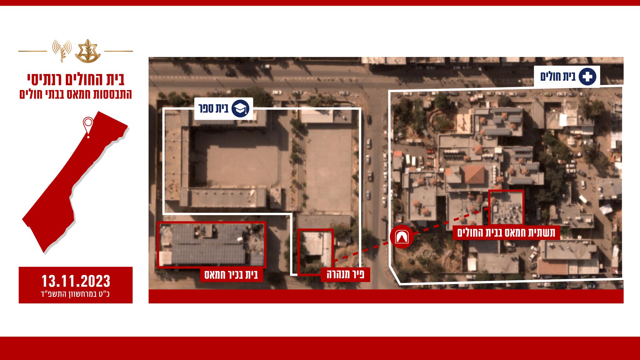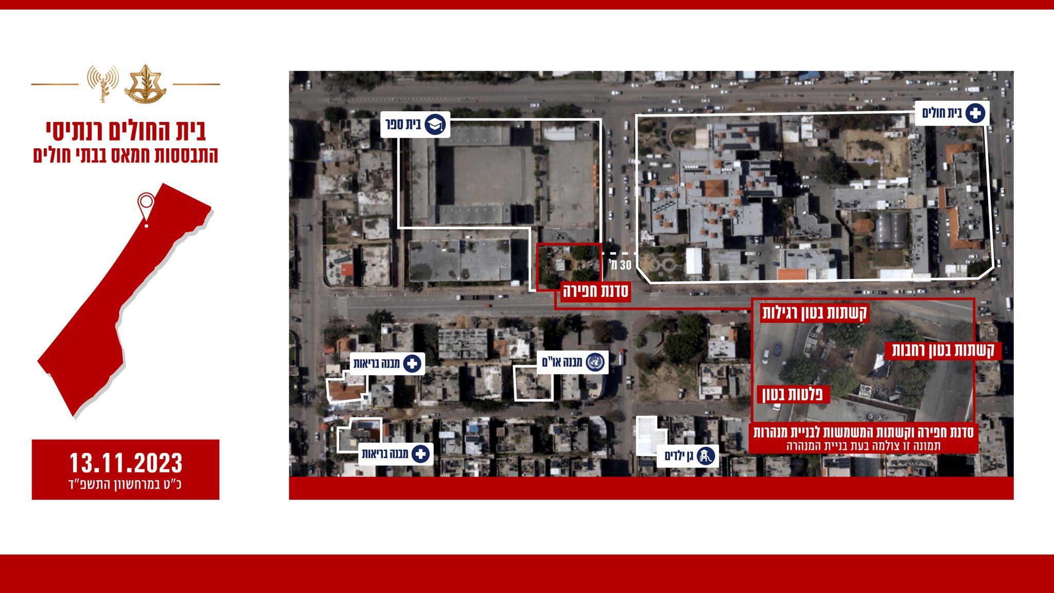 בית החולים רנתיסי – בית החולים משמש להעברת אמצעי לחימה. בנוסף המקום משמש כמפקדה אזורית ממנה מנהלים את מאמצי הלחימה בסביבה כגון מארבים ופעילויות התקפיות וכן גם כמקום מסתור לבכירי החמאס. כמו כן, בבית החולים נמצאו פיר מבצעי של ארגון הטרור חמאס, אמל"ח רב, ואף ישנן עדויות כי במקום הוחזקו חטופים.