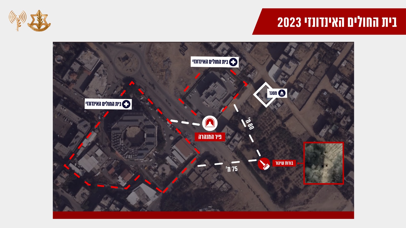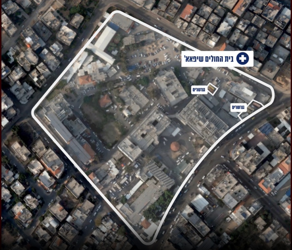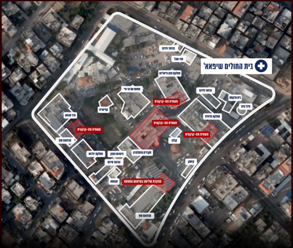 בית חולים שיפאא' – מבני בית החולים משמשים כנכסי חירום לחמ"ל מבצעים של חטיבת העיר עזה. כמו כן, בזמן לחימה, מופנים אמל"ח ואמצעים נוספים לקומות התת-קרקעיות של בית החולים. במסגרת פעילות צה"ל במרחב בית החולים אותרו אמצעי לחימה רבים בבניין ה-MRI שבקומפלקס בית החולים. כמו כן, אותר פיר מנהרה מבצעית, שנבדק בימים אלו ולצידו טנדר עמוס אמל"ח. בנוסף, במחלקת לב נמצא מחסן אמל"ח, תחמושת וחדר חקירות, במחלקת פיזיותרפיה נמצאו מטענים ובבניין הקטארי בבית החולים נמצא מטען ומכשירי קשר. נוסף לכך אף נחשפו השבוע עדויות לכך שחטופים הוחזקו בבית החולים.