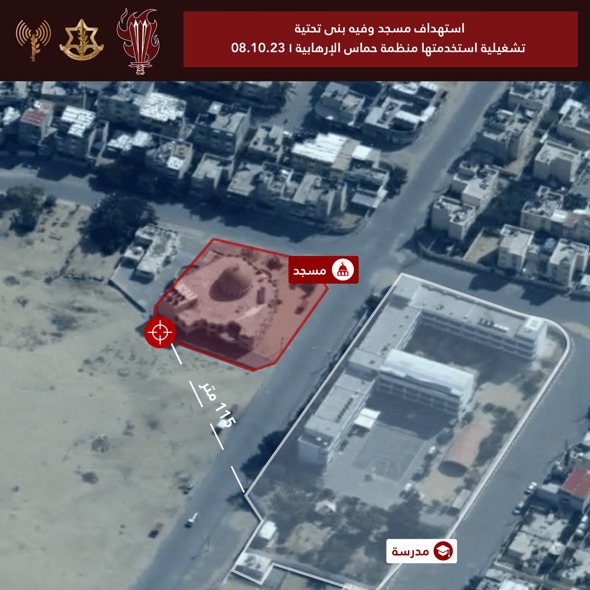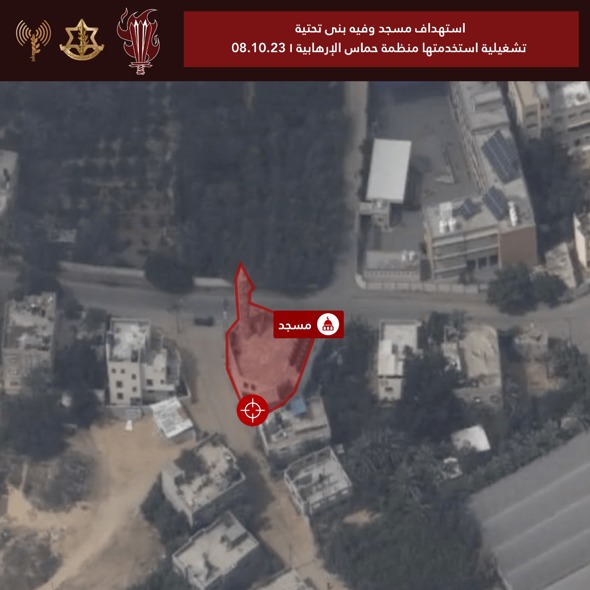 بين مجمل الأمور، شنت الطائرات غارة على مبنى تستخدمه منظمة حماس الإرهابية لإجراء التحقيقات وبنية تحتية عملياتية تستخدمها المنظمة الإرهابية والتي تقع داخل مسجد.
