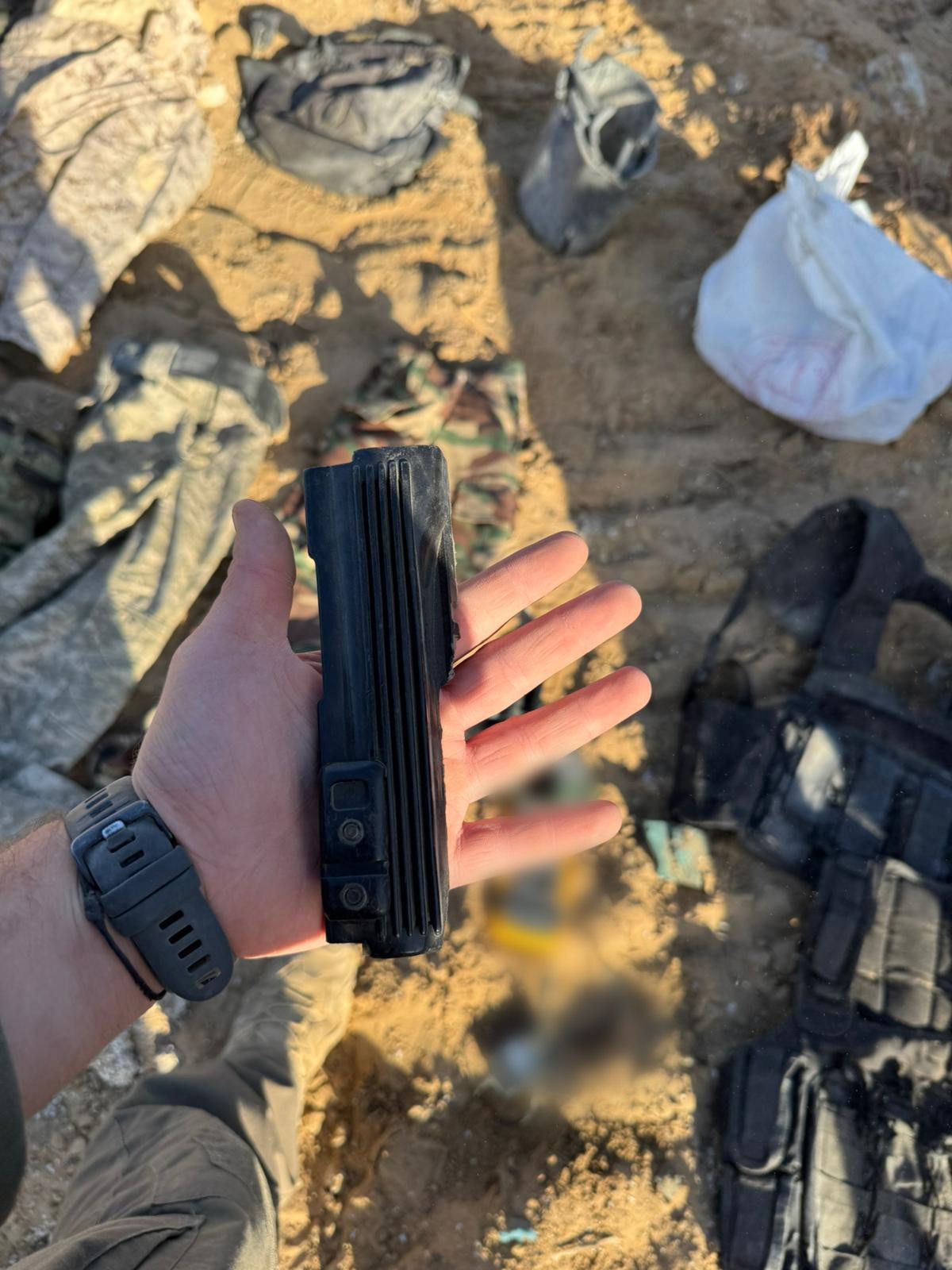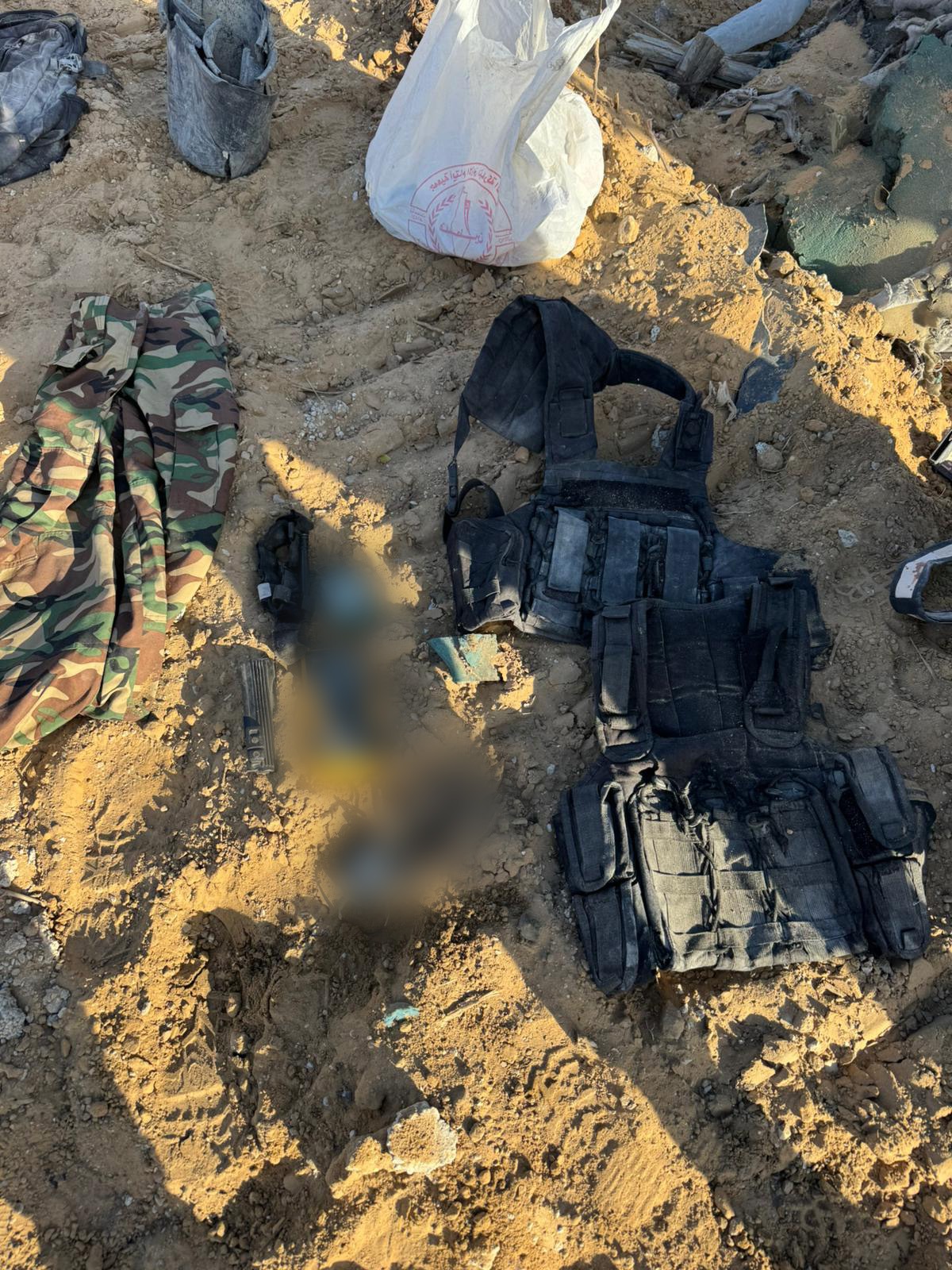 Additionally, a Hamas flag, military gear, and weapons were located in the Rafah area along the yellow line, including: firearms, rifles, explosive devices, magazines, and other weapons.