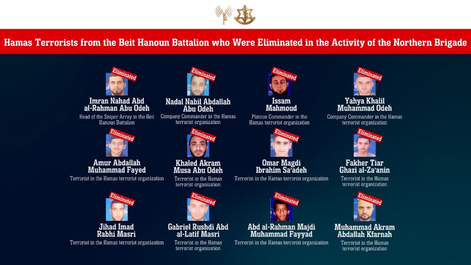 As part of a joint IDF and ISA operation led by the Northern Brigade, terrorists who operated against IDF troops in the Beit Hanoun area, including senior Hamas commanders, were eliminated. Among those eliminated were two company commanders from the Beit Hanoun Battalion who were responsible for dozens of terrorist attacks against IDF troops in the area.