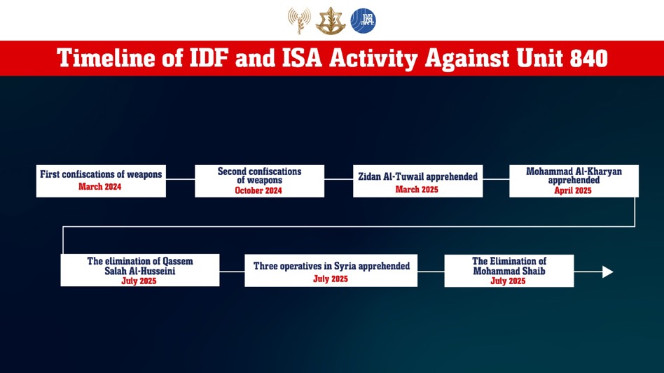 Unit 840 is responsible for advancing and remotely directing acts of terrorism against Israelis and Jews in Israel and abroad. The discreet operations now being revealed combine the significant actions taken against the unit throughout the war, from thwarting attempts to smuggle advanced Iranian weapons into Judea and Samaria, to striking Syrian Army bases in the eastern part of the country that were used by the unit.
