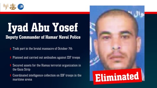 His elimination constitutes a significant blow to the capabilities of Hamas' Naval Police, which serves to collect intelligence on IDF troops and to enforce maritime control for the terrorist organization's military wing.