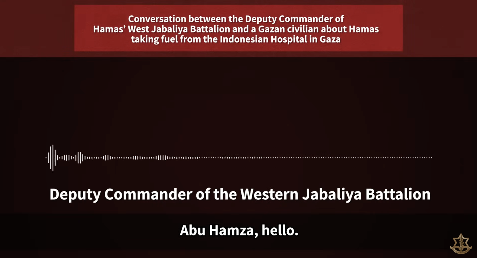 This conversation between a commander of Hamas’s Western Jabaliya Battalion and a Gazan resident, with the participation of the director of the Indonesian Hospital, was intercepted by the Israeli Military Intelligence. Despite the sensitive nature of this intelligence, this intercept is being declassified to expose Hamas’s cynical exploitation of humanitarian resources in the Gaza Strip. The video confirms that Hamas controls energy distribution in Gaza, prioritizing terrorist needs over the needs of their civilian population.
