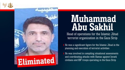 Yesterday (Saturday), with the direction of precise IDF and ISA intelligence, the IAF conducted a precise strike and eliminated the terrorist Muhammad Abu Sakhil, head of operations for the Islamic Jihad terrorist organization in the Gaza Strip. Abu Sakhil operated in a command and control center that was embedded inside a compound that previously served as the 'Fahed al-Sabah' School in the northern Gaza Strip.