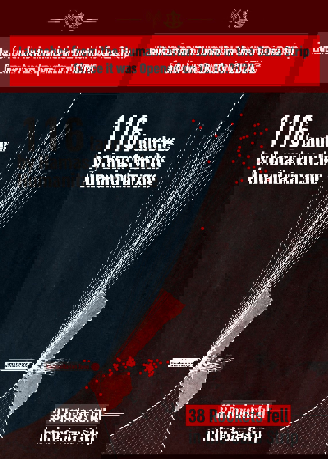On 18.10.23, the IDF designated a humanitarian zone for civilians in the Gaza Strip. Since it’s opening and until today, 116 rockets have been fired from the humanitarian zone toward the State of Israel. 38 of these rockets fell inside of the Gaza Strip.