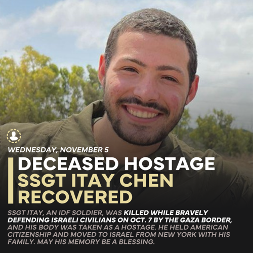 Following the completion of the identification process by the National Institute of Forensic Medicine, in cooperation with the Israel Police and the Military Rabbinate, IDF representatives informed the family of Staff Sergeant Itay Chen that he had been returned for burial.