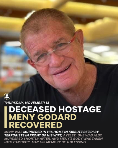 According to the information and intelligence available to the IDF, Meny Godard was murdered by the Islamic Jihad terrorist organization on October 7th and his body was abducted to the Gaza Strip. Meny was 73 years old at the time of his death, and was abducted from his home in Kibbutz Be’eri. His death was officially determined on December 8th, 2023.  He leaves behind four children and seven grandchildren. His wife, Ayelet Godard, was also murdered during the attack on the kibbutz.