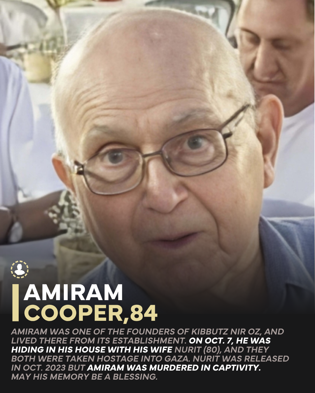 According to the information and intelligence available to the IDF, Amiram Cooper was abducted alive by Hamas from his home in Kibbutz Nir Oz. It is estimated that he was murdered in captivity in February 2024.  Amiram was 84 years old at the time of his death. He leaves behind a wife, four children, and 11 grandchildren.