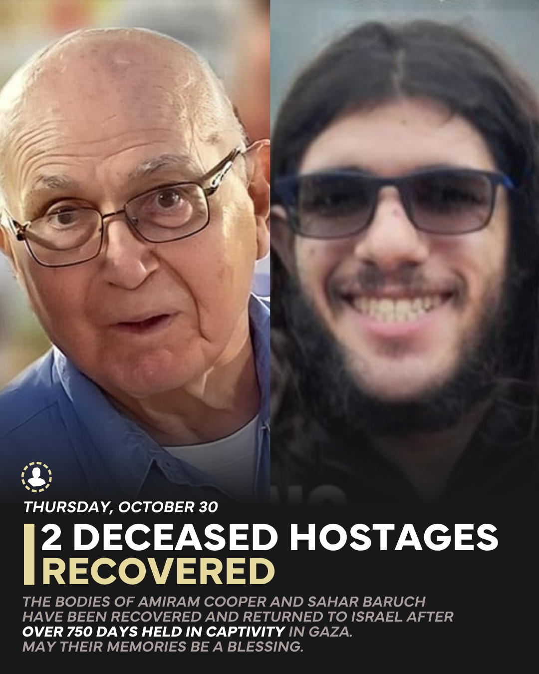 Following the completion of the identification process by the National Institute of Forensic Medicine, in cooperation with the Israel Police and the Military Rabbinate, IDF representatives informed the family of Amiram Cooper and Sahar Baruch that they had been returned for burial.