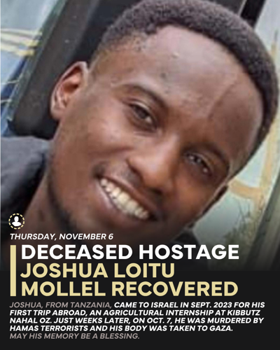 Joshua Lolitu Mollel, a Tanzanian citizen, was an agronomy student who arrived in Israel for agricultural training at the Ibim Agricultural Campus as part of his studies.  According to the information and intelligence available to the IDF, he was murdered by the Hamas terrorist organization on October 7th, 2023, and his body was abducted to the Gaza Strip.
