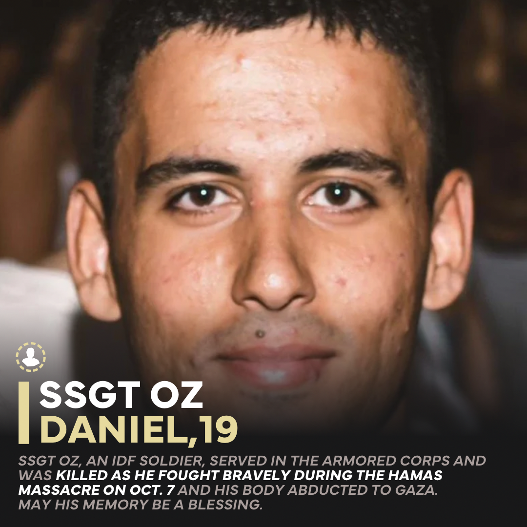 According to the information and intelligence available to the IDF, Staff Sergeant Oz Daniel served as a combat soldier in the 77th Battalion, 7th Brigade. He fell during a defensive battle in the southern communities near the Gaza border the morning of October 7th, 2023, and his body was abducted by the Hamas terrorist organization.