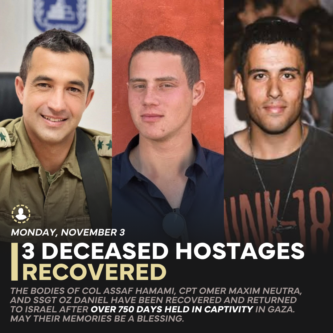 Following the completion of the identification process by the National Institute of Forensic Medicine, in cooperation with the Israel Police and the Military Rabbinate, IDF representatives informed the families of Colonel Assaf Hamami, Captain Omer Maxim Neutra, and Staff Sergeant Oz Daniel that they have been returned for burial.