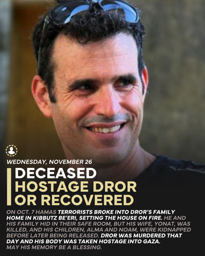 According to the information and intelligence available to the IDF, Dror Or was murdered by the Islamic Jihad terrorist organization on October 7th, 2023, and his body was abducted to the Gaza Strip from his home in Kibbutz Be’eri. His death was officially determined on May 2nd, 2024. Dror Or was 48 years old at the time of his death. He leaves behind three children. His wife, Yonat Or, was also murdered during the attack on the kibbutz. Two of his children, Alma and Noam, were also abducted and returned two years ago, as part of the hostage release agreement in November 2023.