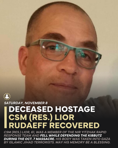 According to the information and intelligence available to the IDF, Command Sergeant Major (Res.) Lior Rudaeff, deputy security coordinator and a member of the Nir Yitzhak rapid response team, fell in battle defending the Kibbutz on October 7th, and his body was taken captive by the Islamic Jihad terrorist organization. Lior was 61 years old at the time of his death, and his death was officially determined on May 7th, 2024. He leaves behind his wife, four children, three grandchildren, father, sister, and brother.