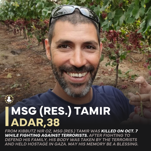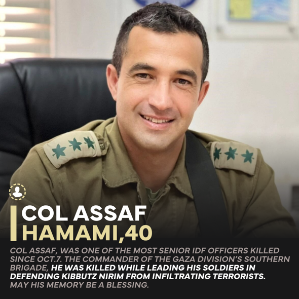 According to the information and intelligence available to the IDF, Colonel Assaf Hamami served as the Commander of the Southern Brigade in the Gaza Division. He fell in battle while fighting in Kibbutz Nirim on the morning of October 7th, 2023, and his body was abducted by the Hamas terrorist organization. Assaf was among the first to reach the combat zones and to fight, and was the first to declare war. He was 40 years old at the time of his death. He leaves behind parents, a brother, his wife, and three children.