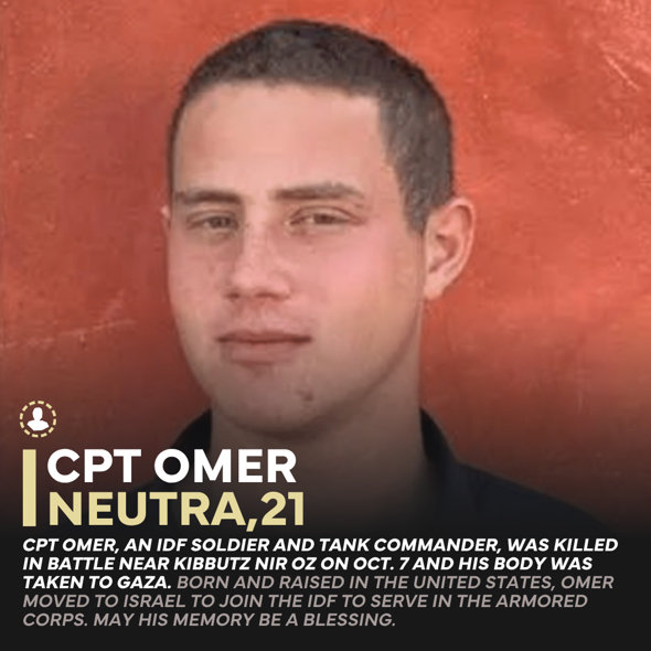According to the information and intelligence available to the IDF, Captain Omer Maxim Neutra immigrated to Israel from the United States as a lone soldier through the “Garin Tzabar” program. He served as a platoon commander in the 77th Battalion, 7th Brigade. He fell during a defensive battle in the southern communities near the Gaza border on the morning of October 7th, 2023, and his body was abducted by the Hamas terrorist organization. His death was officially determined on December 1st, 2024.