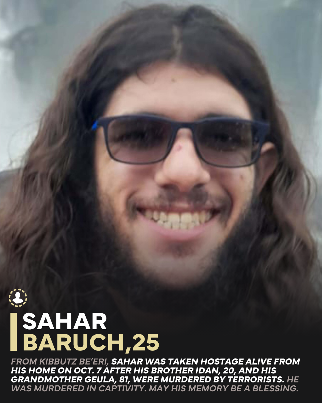 According to the information and intelligence available to the IDF, Sahar Baruch was abducted alive by Hamas from his home in Kibbutz Be'eri. It is estimated that he was murdered in captivity on December 8th, 2023. Sahar was 25 years old at the time of his death. He leaves behind parents and two siblings. His brother, Edan Baruch, and his grandmother, Geula Bachar, were murdered in the attack on the Kibbutz.