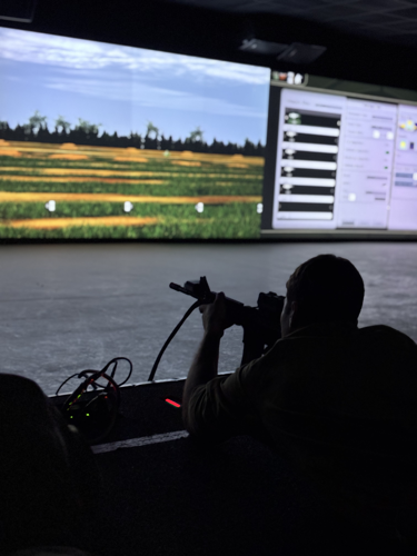 Chaque soldat s’entraîne à tirer sur des cibles mobiles et fixes sur un écran, en utilisant de vraies armes modifiées spécialement pour la simulation. Les armes sont adaptées, et les chargeurs sont remplis d’air comprimé. Lorsqu’ils appuient sur la détente, l’arme reproduit le même recul que celui d’une balle réelle. Un laser fixé sur le canon projette un faisceau de visée, et chaque tir réussi est enregistré. À la fin de la session, le soldat reçoit un score.